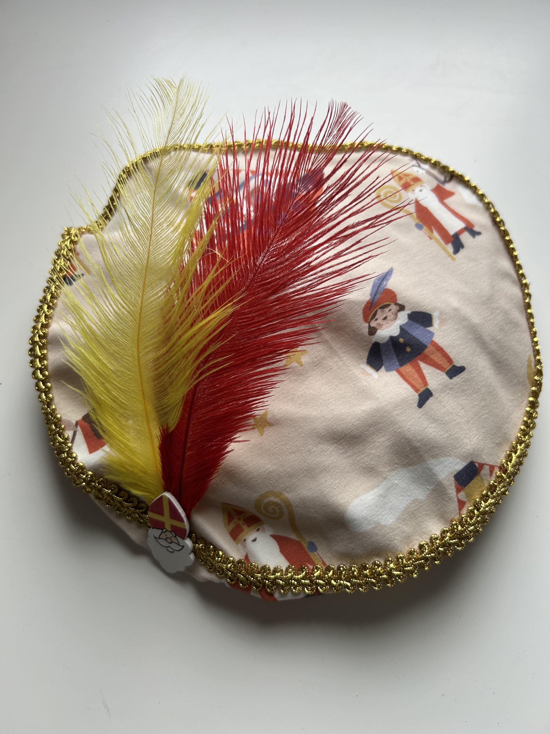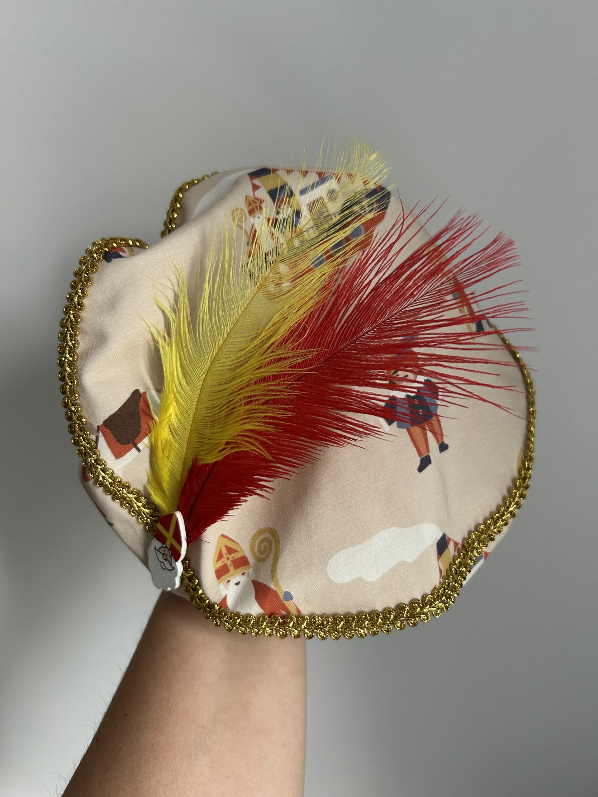 Deze feestmuts is afgewerkt met twee kleurrijke veren én een schattig mini Sinterklaasje als decoratie – een vrolijke combinatie die het feestgevoel compleet maakt.